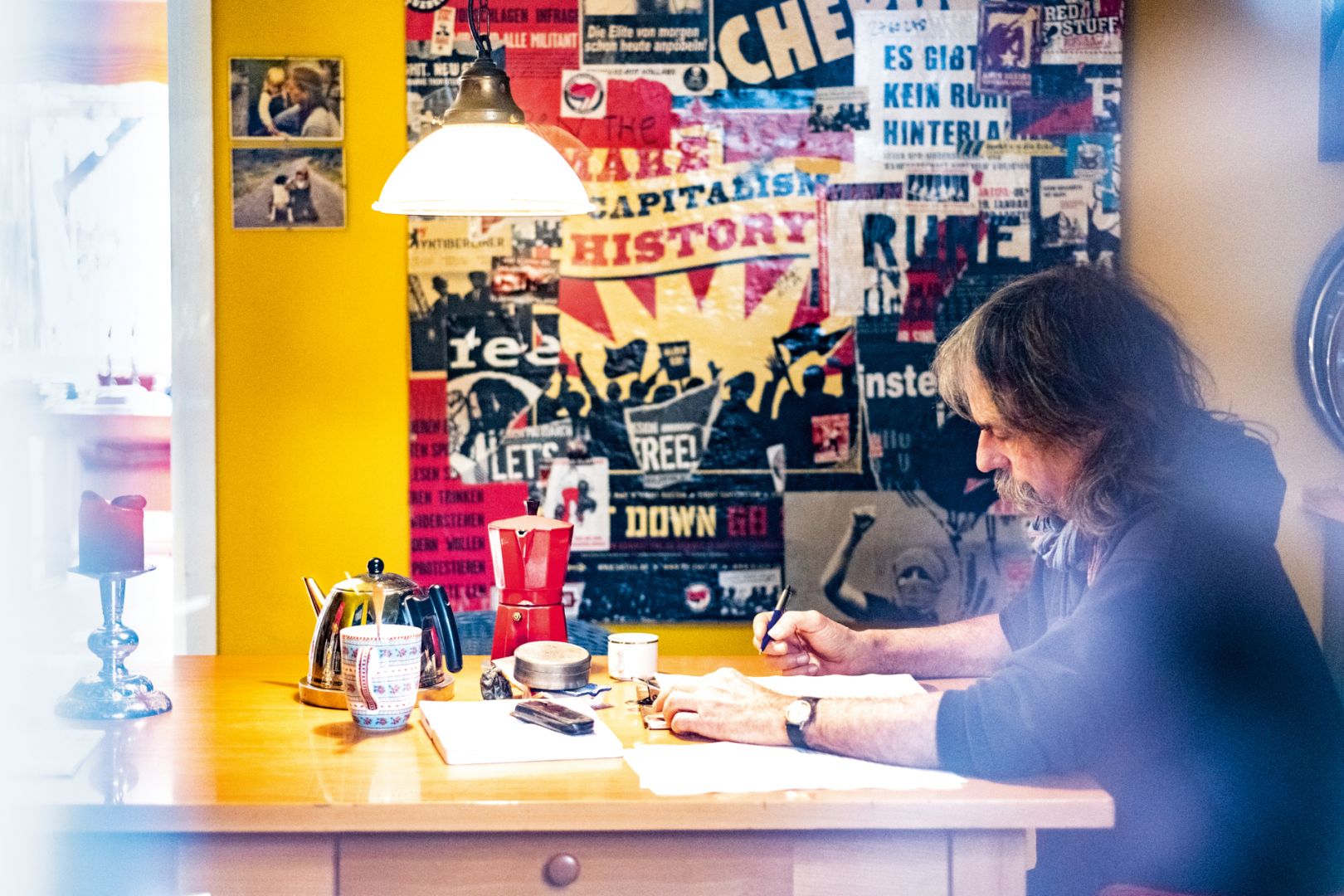 Am Ende eines kleinen Fußweges gegenüber von Feldern, Bäumen und Nebel steht ein Reihenhaus in Bothfeld, das aus der Reihe tanzt. Das Shakespeare-Zitat „A star danced and under that was I born" ist mit Kreide an eine Hauswand geschrieben, ein „Atomkraft? Nein Danke"-Aufkleber auf der Klingel, durch das Fenster springt mir ein auffälliges Plakat mit lauter Typo in Rot, Weiß, Schwarz entgegen – die Collage „Make Capitalism History" des Schriftstellers. Noch bevor ich die Namen Hänel und Gerold auf dem Schild lese, weiß ich, dass dieses Haus zu ihnen gehört und ich hier richtig bin.